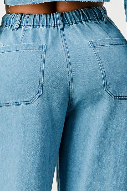 These ATHINA WIDE LEG DENIM PANTS are perfect for a statement-making look. Featuring a blue color, wide leg, high waist, and elastic waistband for comfortable wear, these pants can be worn for day-to-night style.