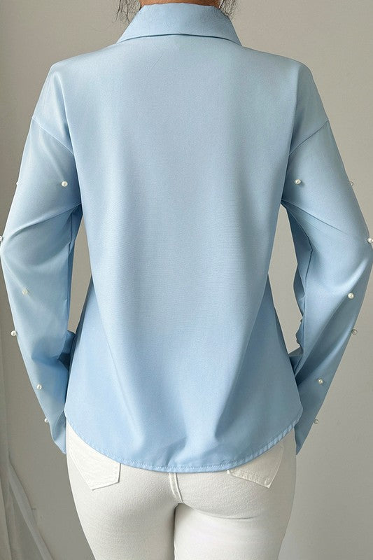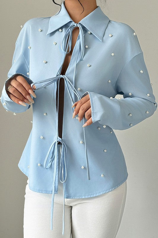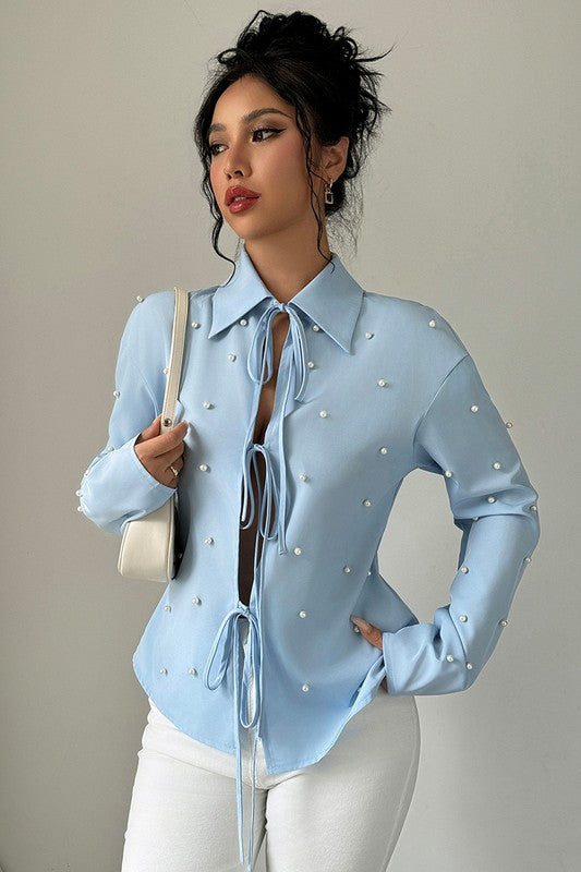 Solid Tie Front Pearl Embellished Fit Blouse